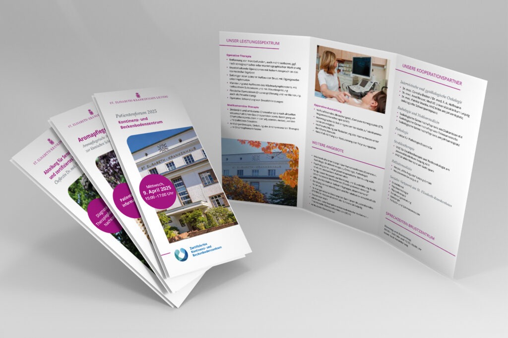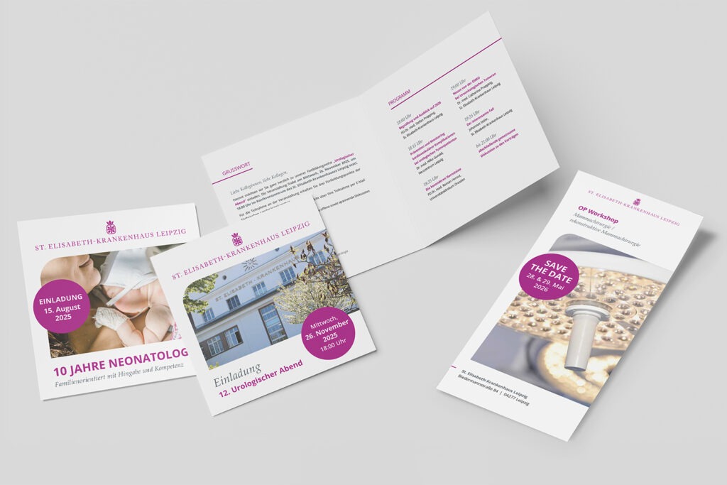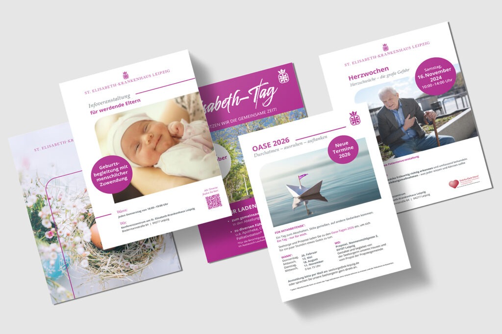 Für das St. Elisabeth-Krankenhaus Leipzig wird in enger Abstimmung mit dem internen Kommunikationsteam das visuelle Erscheinungsbild ganzheitlich für sämtliche Werbemittel entwickelt und umgesetzt. Ziel ist es, die Wahrnehmung des Hauses als moderne, patientenorientierte und leistungsstarke Gesundheitseinrichtung zu stärken sowie die Ansprache von Patienten, Fachkräften und Bewerbern gleichermaßen zu optimieren.